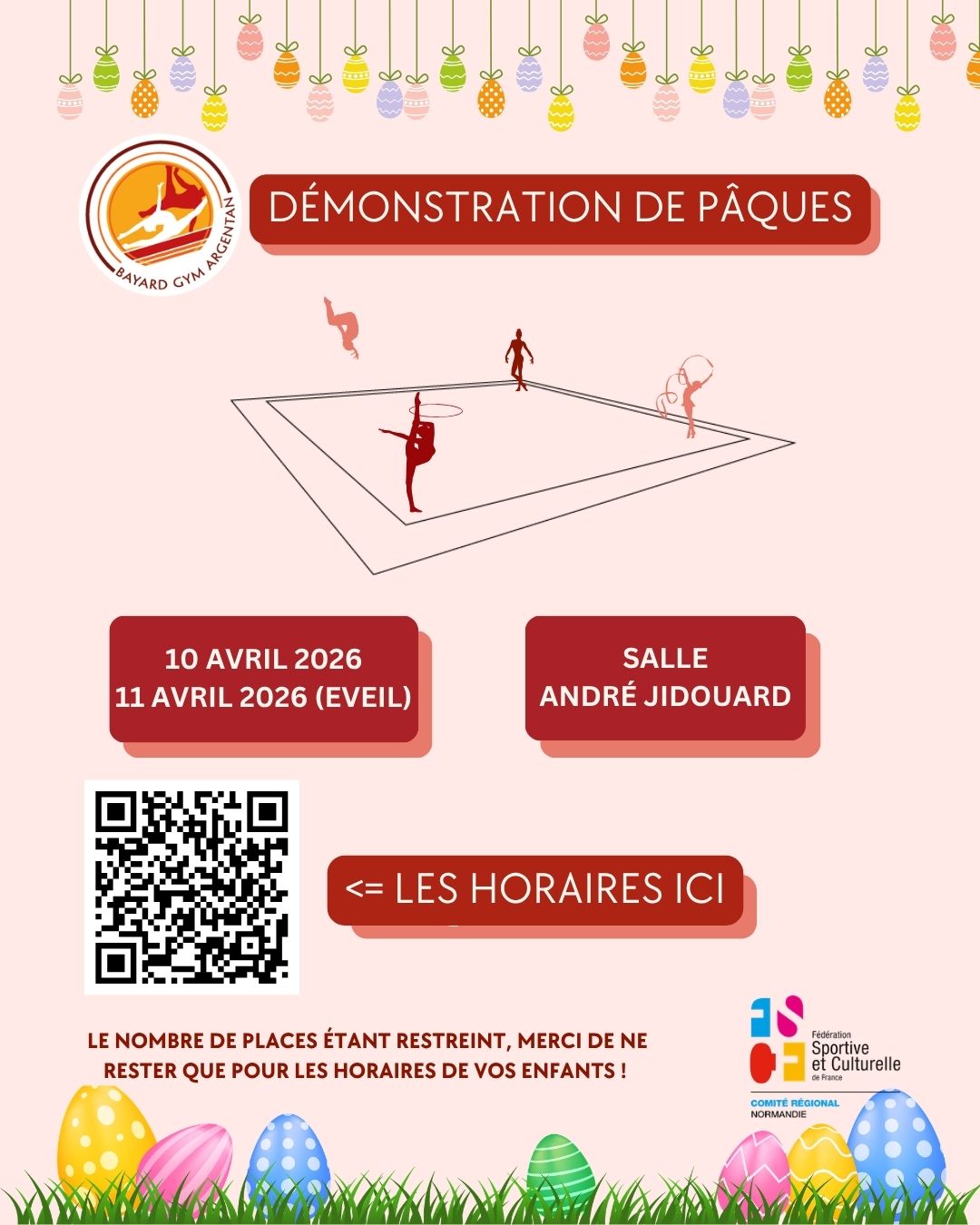 La Bayard Gym Argentan vous invite à sa démonstration de Pâques. Un moment convivial pour venir découvrir les progrès de nos gymnastes et partager leur plaisir de la gymnastique.